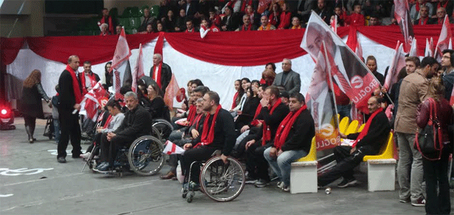 Engelliler, salonda kendilerine özel olarak ayrılan bir bölgede yerlerini aldılar. Bu arada Başbakan Yardımcısı ve Demokrat Parti Ulusal Güçler Genel Başkanı Serdar Denktaş da salona girerek halkı selamlıyor...