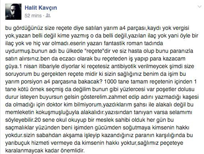 Lefkoşa'da hizmet veren İmge Eczanesi sahibi eczacı Halit Kavçın sosyal medyadan paylaştığı reçeteyi hangi doktorun yazdığını sordu. Reçetenin yarım A4 kağıdına yazıldığını ve üzerinde doktorun adının bulunmadığını söyleyen Kavçın, sosyal medya üzerinden tepkisini gösterdi.