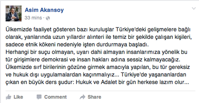 "Ülkemizde faaliyet gösteren bazı kuruluşlar Türkiye'deki gelişmelere bağlı olarak, yanlarında uzun yıllardır alınteri ile temiz bir şekilde çalışan kişileri, sadece etnik kökeni nedeniyle işten durdurmaya başladı.
