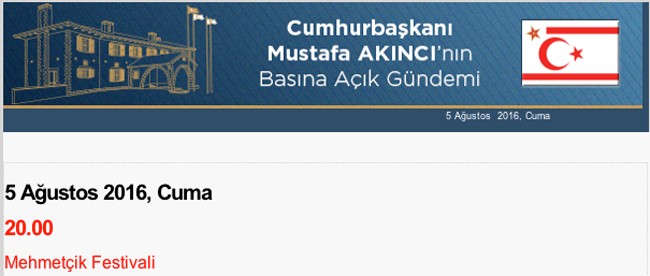 Cumhurbaşkanlığının açıkladığı programa göre Cumhurbaşkanı Mustafa Akıncı, bu akşam Demokrasiye Destek Mitinginin başlayacağı saatlerde Mehmetçik Festivali'nde olacak.