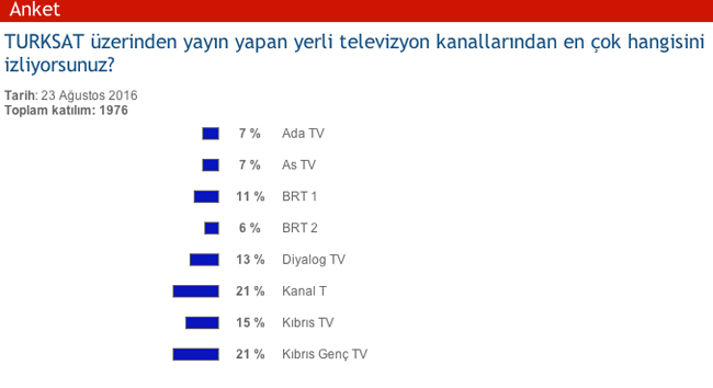 Kıbrıs Postası, okuyucularının katıldığı "TURKSAT üzerinden yayın yapan yerli televizyon kanallarından en çok hangisini izliyorsunuz?" anketi devam ediyor. Halen devam eden ankette, Genç TV ve Kanal T %21'lik bir oranla birinciliği paylaşıyor. Kıbrıs TV ise ikinci sırada yer aldı.