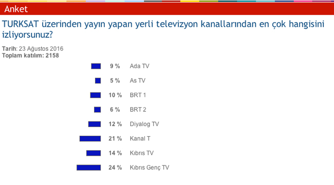 23 Ağustos'ta başlatılan ve 27 Eylül günü sonlandırılan, Kıbrıs Postası okuyucuları arasından 2158 kişinin oy kullandığı ankette "TURKSAT üzerinden yayın yapan yerli televizyon kanallarından en çok hangisini izliyorsunuz?" sorusu cevaplandı.