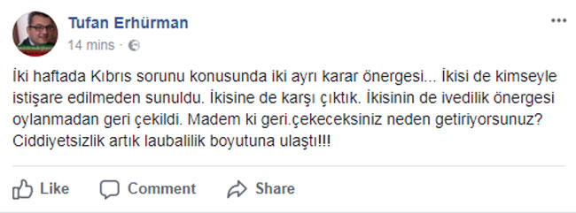 Erhürman'ın açıklaması şöyle:"İki haftada Kıbrıs sorunu konusunda iki ayrı karar önergesi... İkisi de kimseyle istişare edilmeden sunuldu.