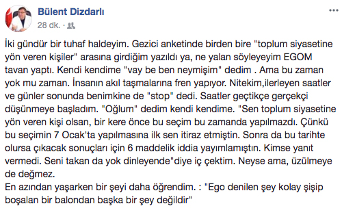 "İki gündür bir tuhaf haldeyim. Gezici anketinde birden bire "toplum siyasetine yön veren kişiler" arasına girdiğim yazıldı ya, ne yalan söyleyeyim EGOM tavan yaptı.