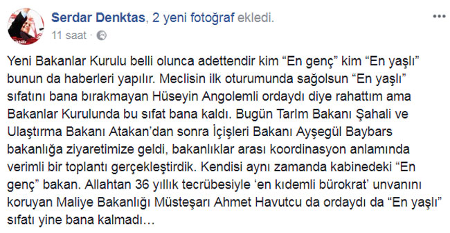 Bakanlıklar arasında koordinasyon amacıyla yapılan bir dizi toplantıyla ilgili bilgi veren Denktaş, "bugün Tarım Bakanı Şahali ve Ulaştırma Bakanı Atakan'dan sonra İçişleri Bakanı Ayşegül Baybars bakanlığa ziyaretimize geldi, bakanlıklar arası koordinasyon anlamında verimli bir toplantı gerçekleştirdik. Kendisi aynı zamanda kabinedeki "En genç" bakan. Allahtan 36 yıllık tecrübesiyle 'en kıdemli bürokrat' unvanını koruyan Maliye Bakanlığı Müsteşarı Ahmet Havutcu da ordaydı da "En yaşlı" sıfatı yine bana kalmadı" diyerek esprili bir açıklama yaptı.