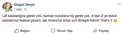 Derya, "Lâf kalabalığına gerek yok, hamasi nutuklara hiç gerek yok. A'dan Z'ye bütün planlarımız federal çözüm, tek limanımız ortak yurt Birleşik Kıbrıs! That's it" şeklinde yaptığı yorumuna kısa sürede yüzlerce beğeni geldi.