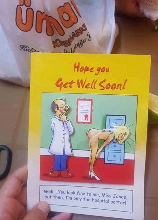 "Umarım yakında iyileşirsin" başlıklı kartta, erkek figür, eğilen yarı çıplak kadına "Güzel Bana iyi görünüyorsun Bayan Jones fakat ben sadece hastane bekçisiyim" diyor.