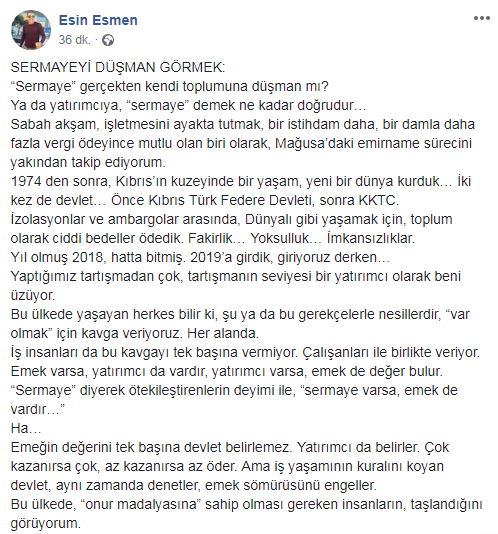Adanın hem kuzeyinde hem de güneyinde perakende mağazalar zinciri sahibi iş insanı Esin Esmen, sosyal medya hesabından yaptığı paylaşımda, ülkeye çokça katkısı bulunan sermaye sahibi insanların düşman olarak görülmemesi gerektiğini savundu.