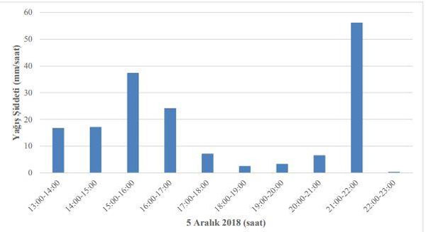 Gün içerisindeki yağışın dakikalık verilerini Meteoroloji Dairesi'nden edindikleri verilere dayandırarak açıklayan Akıntuğ, 5 Aralık günü saat 13.00 ile 21.00 saatleri arasında gerçekleşen yağışın saatte maksimum 30 ile 40 mm'lik bir oranla yağdığını fakat saatler 21.00'ı gösterdiğinde bu oranın saatte 50 ile 60 mm arasına çıktığını ifade etti.