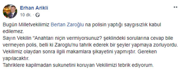"Bugün Milletvekilimiz Bertan Zaroğlu na polisin yaptığı saygısızlık kabul edilemez. Sayın Vekilin "Anahtarı niçin vermiyorsunuz? şeklindeki sorularına cevap bile vermeyen polis, belli ki Zaroglu'nu tahrik ederek bir şeyler yapmaya zorluyordu. Vekilimiz olaydan sonra ilgili makamlara şikayetini yapmıştır. Gereken yapılacaktır. Tahriklere kapılmadan sukunetini koruyan Vekilimizi tebrik ediyorum"