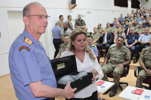 Bilgilendirme toplantısı öncesi Şehit Teğmen Caner Gönyeli'nin özgeçmişi okunarak, eşi Nükhet Gönyeli'ye anı objeleri takdim edildi.