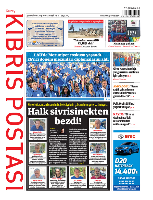 Umut Boyoğlu: "Belediyeler sivrisinekler ile mücadelede yeterli değil, her gün ayrı bir yerimde ısırık var, uykularım bölünüyor" "Kış aylarında yağan yoğun yağışlar sebebi ile son günlerde sivrisineklerde yoğun bir artış var. Lefkoşa için belediyelerin sivrisinekler ile mücadele konusunda yeterli olmadığını düşünüyorum. Belediye nerelerde çalışma yapıyor bilmiyorum, ama Dereboyu'nda ikamet ediyorum ve sivrisineklerden aşırı rahatsızlık duyuyorum. Her gün ayrı bir yerimde sivrisinek ısırığı ile uyanıyorum. Bu nedenle zorlanıyorum. Uykularım bölünüyorum. Yetkililer acil çözüm bulmalı"
