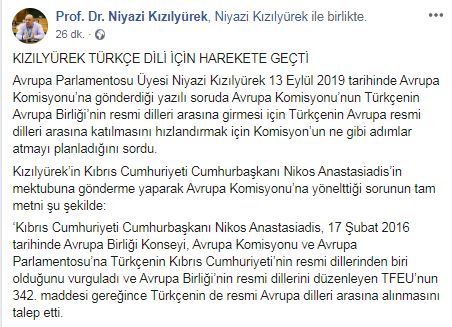 Avrupa Parlamentosu Üyesi Niyazi Kızılyürek, 13 Eylül 2019 tarihinde Avrupa Komisyonu'nun Türkçenin Avrupa resmi dilleri arasına katılmasını hızlandırmak için neler yapacağını sorarak konu ile ilgili harekete geçtiğini sosyal medya hesabından duyurdu.