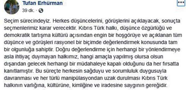 "Seçim sürecindeyiz. Herkes düşüncelerini, görüşlerini açıklayacak, sonuçta seçmenlerimiz karar verecektir. Kıbrıs Türk halkı, düşünce özgürlüğü ve demokratik tartışma kültürü açısından engin bir hoşgörüye ve açıklanan tüm düşünce ve görüşleri rasyonel bir biçimde değerlendirmek konusunda tam bir olgunluğa sahiptir. Doğru değerlendirme için herhangi bir yönlendirmeye asla ihtiyaç duymayan halkımız, hangi amaçla yapılmış olursa olsun dışarıdan gelecek herhangi bir müdahaleye kapalı olduğunu da her fırsatta kanıtlamıştır. Bu süreçte herkesin sağduyu ve sorumluluk duygusuyla davranması ve her türlü manipülasyondan uzak durulması Kıbrıs Türk halkının varlığına, kültürüne, kimliğine ve iradesine saygının gereğidir."