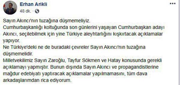 Milletvekilimiz Sayın Zaroğlu, Tayfur Sökmen ve Hatay konusunda gerekli açıklamayı yapmıştır. Bunun dışında Sayın Akıncı ve propagandistlerine mağdur edebiyatı yaptıracak açıklamalar yapılmamasını, tüm dava arkadaşlarımdan rica ediyorum."