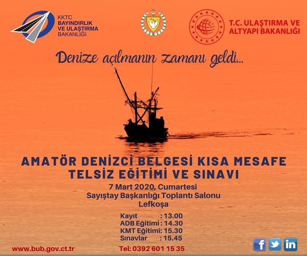 Amatör Denizci Belgesi (ADB) Kısa Mesafe Telsiz (KMT) Operatörlüğü 5. eğitim ve sınavı, 7 Mart Cumartesi günü Lefkoşa’daki Sayıştay Başkanlığı toplantı salonunda gerçekleşecek.