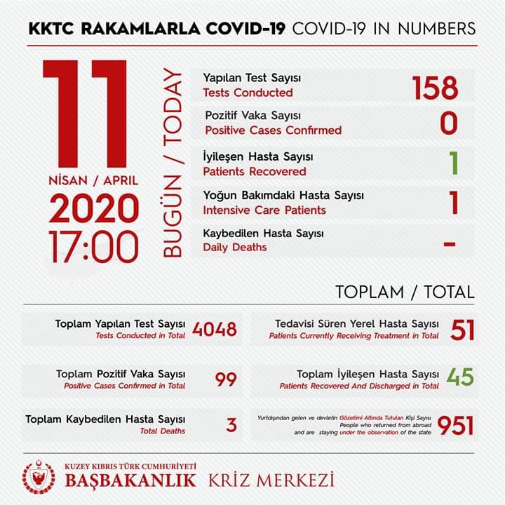 Sağlık Bakanlığı’ndan yapılan yazılı açıklamada bugün toplam 158 test yapıldığı ve pozitif vakanın çıkmadığı söylendi.