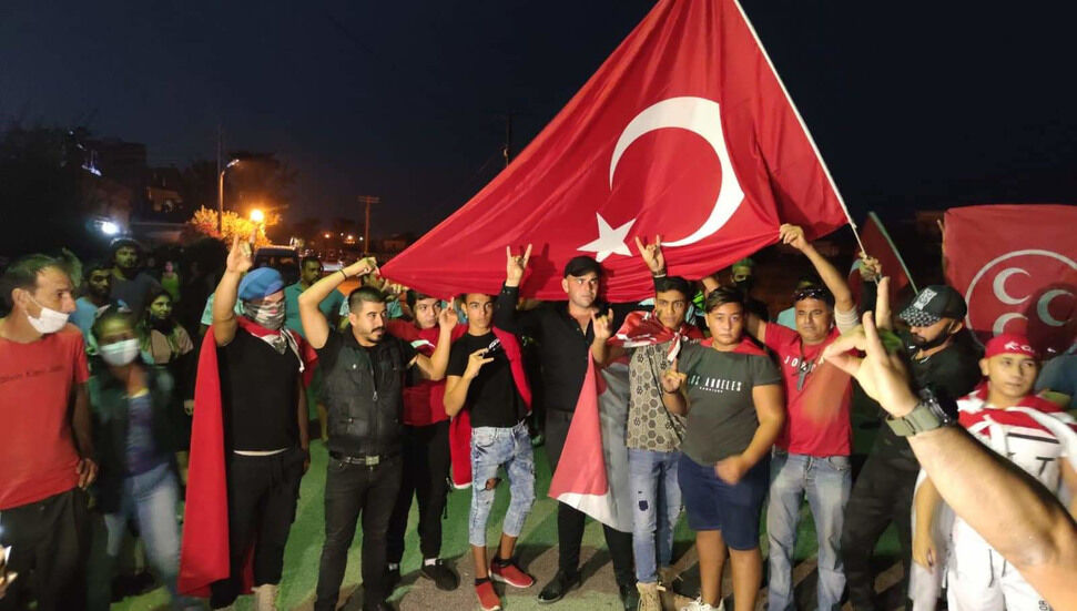 Eyleme tepki gösteren bir grup Kıbrıslı Türk geçişe kapatılan barikat yakınında toplandı.