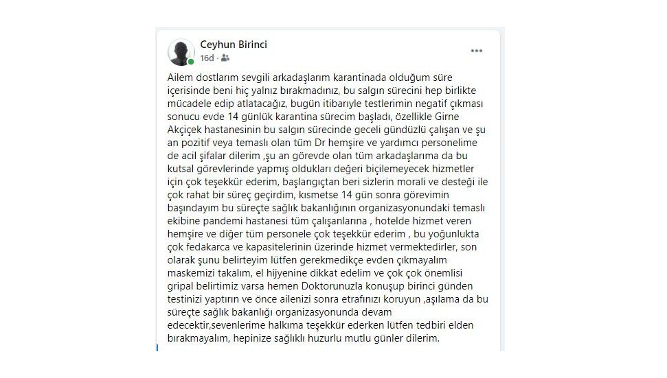Başlangıçtan beri sizlerin morali ve desteği ile çok rahat bir süreç geçirdim, kısmetse 14 gün sonra görevimin başındayım bu süreçte sağlık bakanlığının organizasyonundaki temaslı ekibine pandemi hastanesi tüm çalışanlarına, hotelde hizmet veren hemşire ve diğer tüm personele çok teşekkür ederim.