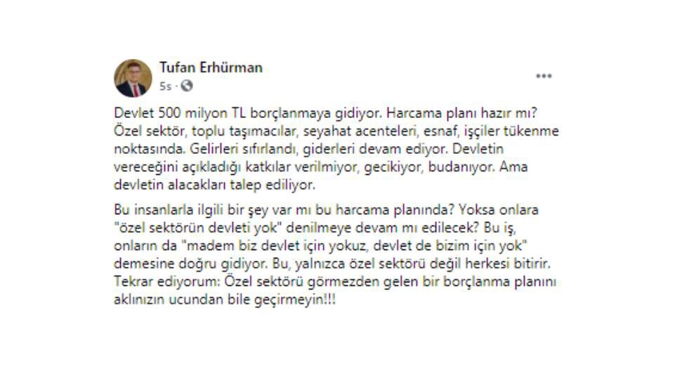 Erhürman, “Harcama planı hazır mı? Özel sektör, toplu taşımacılar, seyahat acenteleri, esnaf, işçiler tükenme noktasında” ifadelerini kullanarak, “Gelirleri sıfırlandı, giderleri devam ediyor. Devletin vereceğini açıkladığı katkılar verilmiyor, gecikiyor, budanıyor. Ama devletin alacakları talep ediliyor” dedi.