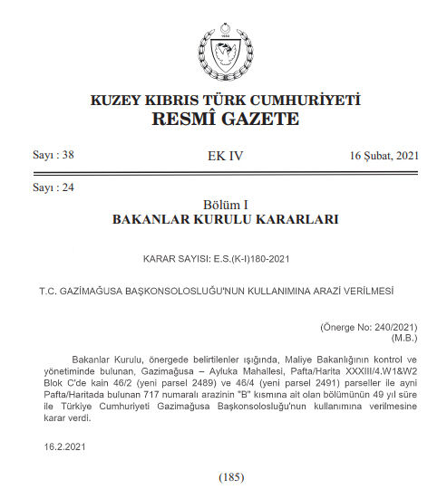 Bakanlar Kurulu, Maliye Bakanlığı'nın kontrol ve yönetiminde bulunan, Gazimağusa - Ayluka Mahallesi, Pafta/Harita XXXlll/4.W1&W2 Blok C'de kain 46/2 (yeni parsel 2489) ve 46/4 (yeni parsel 2491) parseller ile aynı Pafta/Haritada bulunan 717 numaralı arazinin "B" kısmına ait olan bölümünün 49 yıl süre ile Türkiye Cumhuriyeti Gazimağusa Başkonsolosluğu'nun kullanımına verilmesi yönünde karar aldı.