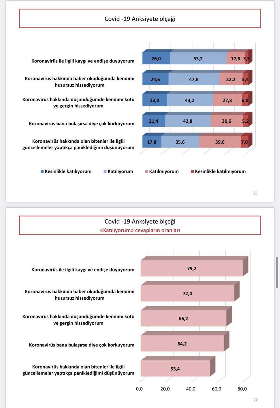 Anketin Covid-19 anksiyete ölçeğinde de birbirinden dikkat çekici sonuçlar olduğu görülüyor. Buna göre ankete katılanların yüzde 79.2'si 'Koronavirüs ile ilgili kaygı ve endişe duyduğunu' belirtmiş. Yüzde 72.4'lük bir kısım ise Koronavirüs hakkında haber okuduğunda 'mutsuz' olduğunu ifade ederken, yüzde 66.2'lik bir kesim, Koronavirüs hakkında düşündüğü zaman kendini kötü ve gergin hissettiğini belirtmiş. Yüzde 63.2'lik bir kısım virüs bulaşacak diye endişe ederken, yüzde 53.4'lük bir kesim de korona hakkında bilgilerini güncellerken 'paniklediğini' ankete yansıtmış.