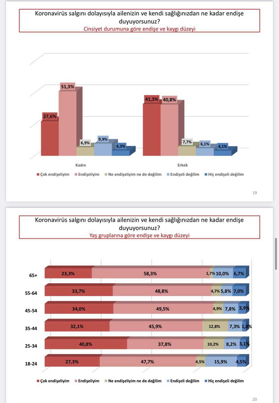 Ankete göre, halkın yüzde 80.2'si kendisinin veya ailesinin sağlığından endişe duyduğunu belirtti. Öte yandan yüzde 72.4'lük bir kesimin Koronavirüs hakkında haber okuduğu zaman korku ve endişeye kapıldığı ankete yansırken, yüzde 64.2'lik bir kısmın ise virüse bulaşma endişesi yaşadığı ortaya çıktı.