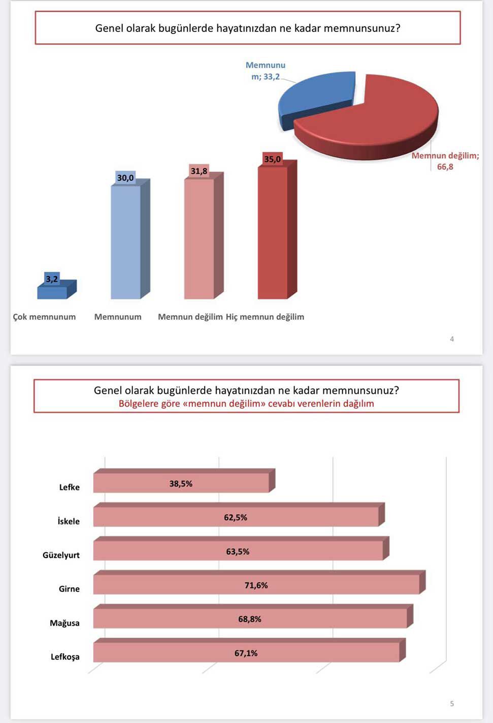 3-7 Şubat arasında toplam 500 kişinin telefon üzerinden katılımıyla yapılan anketin sonuçlarına göre, KKTC halkının genel olarak hayattan memnuniyet durumunun da sorulduğu anketin ilgili bölümünde son derece çarpıcı sonuçlar elde edildi. Buna göre, KKTC halkının yüzde 66.8'i hayatından memnun değilken, bu oranın erkekler arasında yüzde 70.4, kadınlar arasında ise yüzde 64.5'e denk gelmesi bir başka dikkat çekici husus olarak ankete yansıdı.