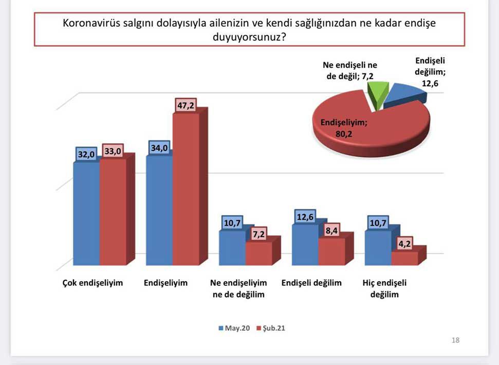 "Koronavirüs salgını dolayısıyla ailenizin ve kendi sağlığınızdan ne kadar endişe duyuyorsunuz?" şeklindeki soruya yüzde 80.2'lik kısım 'çok endişeliyim/endişeliyim' diye cevap verirken, yüzde 12.6'lık bir kesimin bu konuda endişeli olmadığını belirtti. Lipa'nın Mayıs 2020'de yaptığı araştırmanın ilgili bölümüyle karşılaştırıldığında, pandeminin etkisiyle geçen 8 ayın ardından endişe duyanların oranı yüzde 66 seviyesinden yüzde 80'lere çıkması dikkat çekerken, endişeli olmayanların oranında yaklaşık yüzde 10'luk bir düşüş yaşandı.