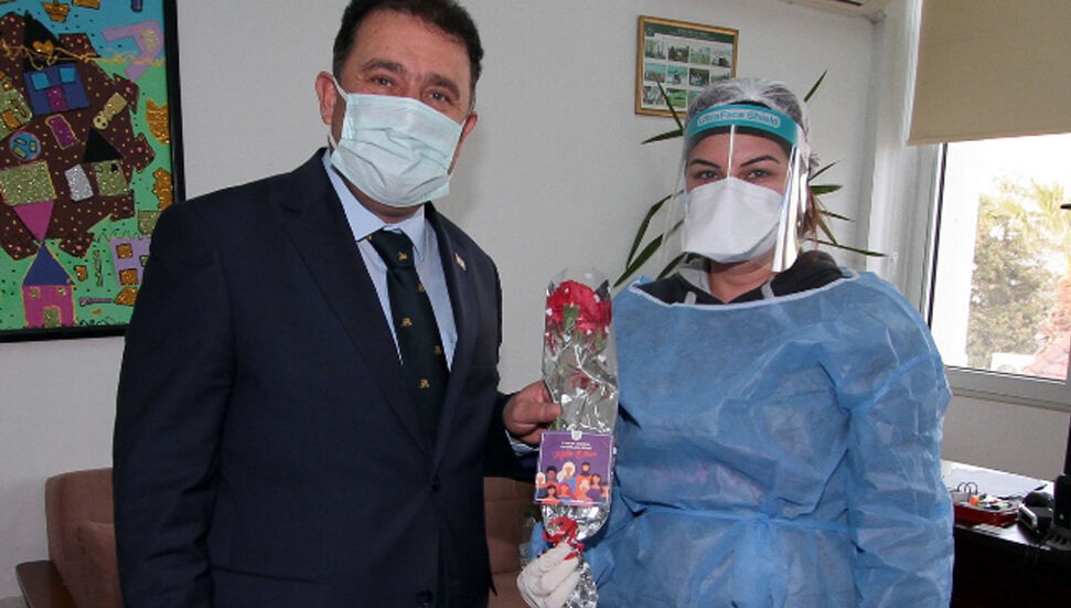Başbakan Saner kontrol amaçlı PCR testi yapmak üzere Başbakanlık’ta bulunan kadın sağlık çalışanına da çiçek takdim ederek bu çiçeği tüm sağlık çalışanları adına takdim ettiğini belirterek bu dönemde koydukları üstün performans, çaba ve gayret için de tüm sağlık çalışanlarına teşekkür etti. Sağlık çalışanları ile hatıra fotoğrafı da çektirdi.