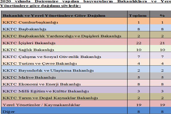 Ombudsmana 2020 yılında 101 kişisel başvurunun yapıldığı bildirildi. 69 başvuruyla Lefkoşa en çok başvuru yapılan ilçe oldu. 2020’deki başvuruların yüzde 21’lik kısmının İçişleri Bakanlığı, yüzde 19’unun Yerel Yönetimler-Kaymakamlıklar ve yüzde 10’unun Sağlık Bakanlığı’nın yetki alanıyla ilgili olduğu açıklandı.