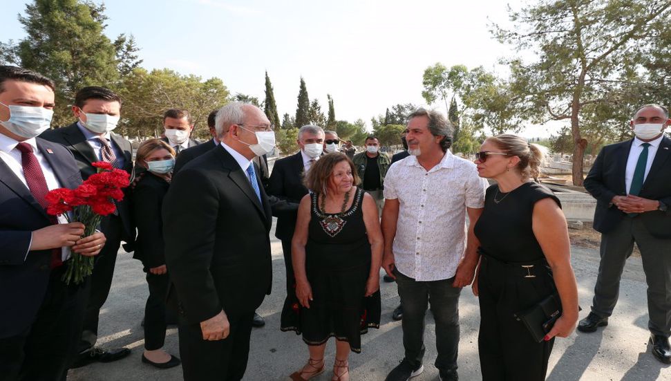 Kutlu Adalı'nın eşi İlkay Adalı ve ailesiyle birlikte Adalı'nın Lefkoşa'daki kabrine ziyarette bulunan Kılıçdaroğlu, karanfil bıraktı ve dua etti.