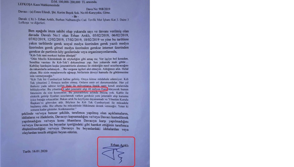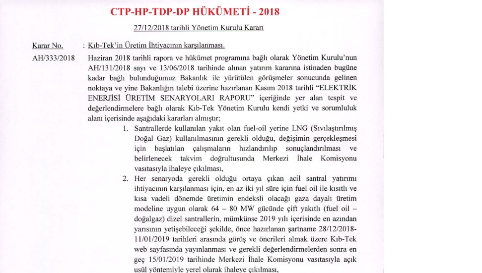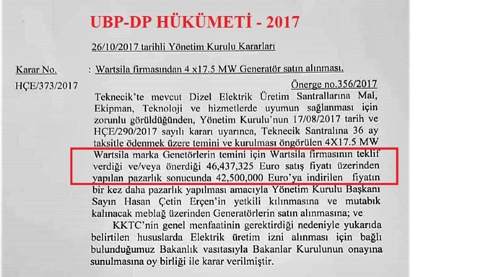 4 adet jenaratörün keşif bedeli; KDV dahil 50 Milyon Euro idi. O zamanki Kıb Tek yönetimi de bunun altına imza atmıştı."
