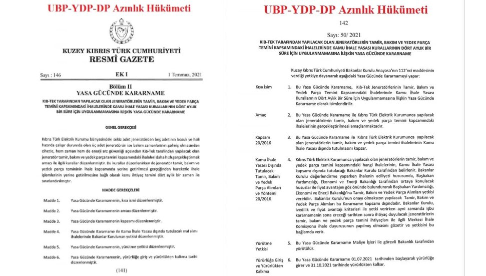 1-) 2017 Yılında UBP-DP Hükümeti döneminde Yerel/Uluslararası İhale ile değil Erhan Arıklı'nın en sevdiği yöntem olan ADRESE TESLİM DOĞRUDAN ALIM yöntemi ile 4 Adet TEK YAKITLI (Fuel Oil) Dizel Jeneratörün alınması için karar üretmişti. Pazarlık sonucunda kayıtlara geçen son fiyat 42,500,000€ idi. (Karar Ekte mevcuttur)