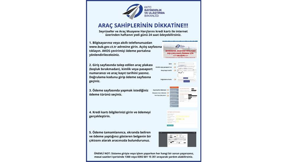 Açıklamada, araç sahiplerinin internet üzerinden seyrüsefer veya muayene harcı ödemek isterken herhangi bir sorun ile karşılaşmaları halinde, mesai saatleri içerisinde 1300 veya 0392 601 15 35’i arayarak yardım alabilecekleri belirtildi.
