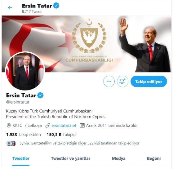 Açıklamada, Cumhurbaşkanı Ersin Tatar’ın Twitter hesabının Aralık 2011 tarihinden beri aktif ve 150 bini aşkın takipçisinin bulunduğu belirtildi.