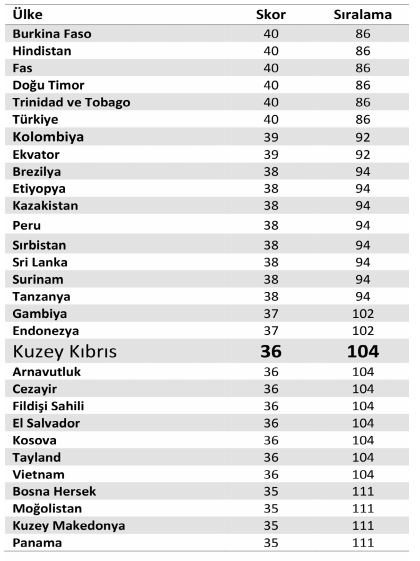 İş insanları ve uzmanların sorulara verdiği yanıtlar bir araya getirildiği zaman, KKTC’nin TI-CPI 2020 skoru 100 üzerinden 36 olarak hesaplandı. 2021 yılının başında Uluslararası Şeffaflık Örgütü tarafından yayınlanan 2020 yılına ait listedeki 180 ülkenin ortalaması olan 43’ün altındadır ve KKTC’yi 104’üncü sıraya yerleştiriyor.