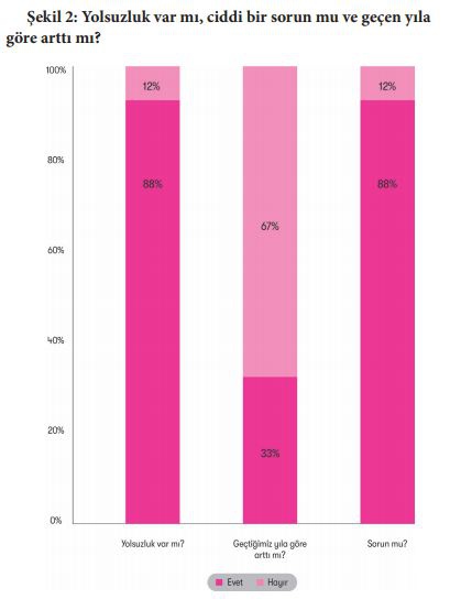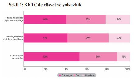 Ankete göre, Kıbrıs’ın kuzeyinde yolsuzluğun yaygın olduğu ve ciddi bir sorun olduğu belirtilirken, ankete katılan iş insanlarının yüzde 88’i KKTC’de rüşvet ve yolsuzluk olduğunu düşünüyor. Öte yandan yüzde 58’i ise yolsuzluğun ‘çok ciddi bir sorun’ olduğu kanaatinde.