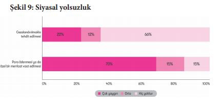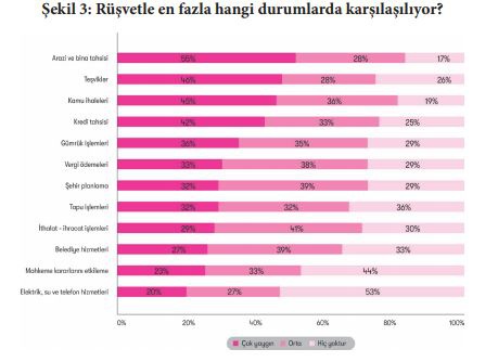 Ülkedeki yolsuzluğun en fazla kamuya ait taşınmazların kullandırılmasın gerçekleştiğini de ortaya koyan anket, katılımcılara göre ‘rüşvet ya da el altından fazladan ödeme yapmanın’ en yaygın olduğu üç işlem şu şekilde sıralandı: