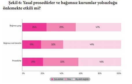 Benzer şekilde, bağımsız mali denetim kurumları bulunduğunu düşünenlerin sadece yüzde 19’u bu kurumların yolsuzluğu engellemekte ‘çok etkili’ olduğuna inanmakta.