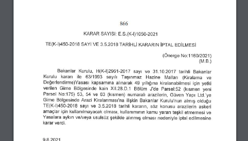 “Bakanlar Kurulu, H(K-I)2961-2017 sayı ve 31 .10.2017 tarihli Bakanlar Kurulu kararı ile 63/1993 sayılı Taşınmaz Hazine Malları (Kiralama ve Değerlendirme)Yasası kapsamına ınarak 49 yıllığına kiralanabilmesi için yetki verilen Girne Bölgesinde kain Xll.28.D.1 Bölüm J'de Parsel:52 (kısmen yeni Parsel No: 175) 53, 54 ve 63 (kısmen) numaralı arazilerin, Güven Yapı Ltd.'ye Girne Bölgesinde Arazi Kiralanması'na ilişkin Bakanlar Kurulu'nun almış olduğu TE(K-I)450-2018 sayı ve 3.5.2018 tarihli kararın, söz konusu arazilerin askeri amaçlar için kullanılmayacak olması, kullanımının kamu yararı teşkil etmemesi ve Yasalara aykırı ve/veya usulsüz şekilde alınmış olması nedeniyle iptal edilmesine karar verdi.”