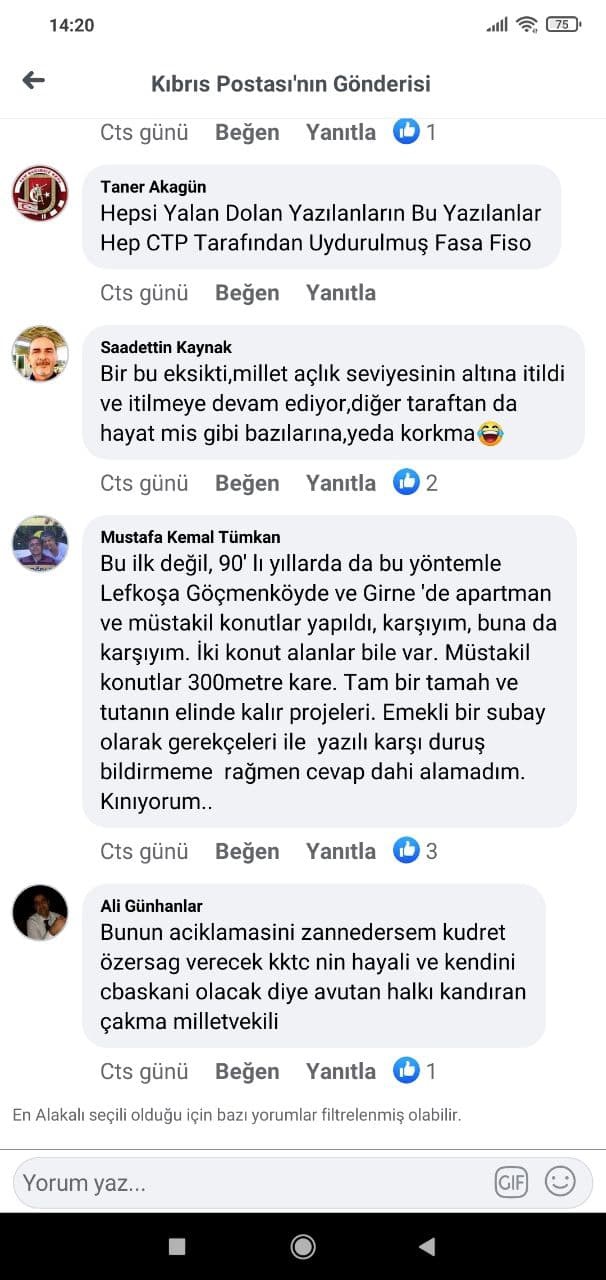 “Bu ilk değil, 90’lı yıllarda da bu yöntemle Lefkoşa Göçmenköy’de Ve Girne’de apartman ve müstakil konutlar yapıldı. Karşıyım buna da karşıyım. 2 konut alanlar bile var. Müstakil konutlar 300 metre Kare. Tam bir tamah ve tutanın elinde kalır projeleri. Emekli bir subay olarak gerekçeleri ile yazılı karşı duruş bildirmeme rağmen cevap dahi alamadım. Kınıyorum.”