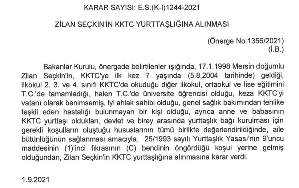 Buna ilaveten, Bakanlar Kurulu’na yabancı uyruklu kişilere istisnai olarak KKTC vatandaşlığı verme konusunda kendisine tanınan yetkinin suiistimal edildiği görülmektedir. Bu örnekte görülebileceği gibi, KKTC vatandaşlığı verilmesi için Yasada sayılan istisnai koşulların hiçbirine sahip olmayan kişilere bu kadar kolayca vatandaşlık verilmesi hem mevcut KKTC vatandaşlarına hem de yasal kriterlere sahip olan vatandaş adaylarına yapılmış çok büyük bir haksızlıktır.