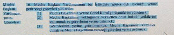 Meclis iç tüzüğünde Başkan Yardımcısının görevleri, Meclis Başkanının yerine Genel Kurul görüşmelerini yönetmek; Meclis Başkanının yokluğunda vekâleten onun hukuki yetkilerini kullanmak ve görevlerini yerine getirmek. Görevlerin yerine getirilmesinde Meclis Başkanına yardımcı olmak ve meclis başkanının vereceği görevleri yerine getirmek.” olarak belirtiliyor.