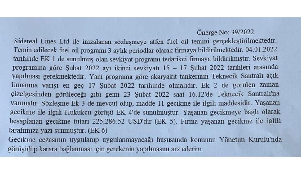 Kıb-Tek'e akaryakıt getirmeye hak kazanan Sideral Denizcilik isimli firmanın sözleşmeye uymadığı ve yakıtı geç getirdiği ortaya çıktı. Kıb-Tek, ilgili firmanın sözleşmeye uymadığı gerekçesiyle kuruma 225 bin 286.52 Dolar ödeme yapması gerektiğini yönetim kuruluna bildirdi.