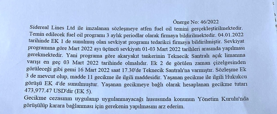 Teknecik’e yakıtı ikinci kez geç getiren Sidereal’e toplam 698 bin 977 Dolar ceza