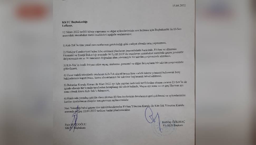 Kıbrıs Türk Elektrik Kurumu Çalışanları Sendikası (EL-SEN) Mali Sekreteri Mustafa Yenigüç, bir yazılı açıklama yaparak, 12 Nisan 2022 tarihinde başlattıkları iş başı yapmama eylemlerini önerileri kabul edilmesi sonucunda son bulduğunu duyurdu.