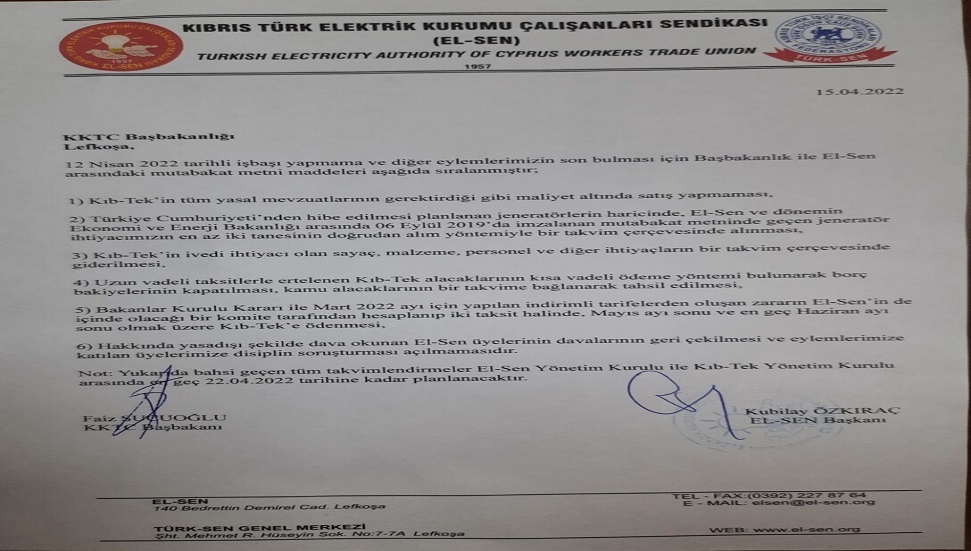 EL-SEN’in borcu olan devlet kurumlarının elektriklerini kesme eyleminde dün Baibakan Faiz Sucuoğlu ile EL-SEN arasında imzalanan protokolle uzlaşı sağlanmış, protokolde KIB-TEK çalışanlarıyla ilgili başlatılan yasal işlemlerin ve okunan davaların da geri çekilmesi maddesine imza koyulmuştu.