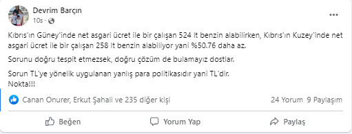 CTP Milletvekili Devrim Barçın, akaryakıt zammını eleştirerek, Kıbrıs’ın güneyinde net asgari ücret ile bir çalışan 524 litre benzin alabildiğini belirterek, "Kıbrıs'ın kuzeyinde ise net asgari ücret ile bir çalışan 258 litre benzin alabiliyor" dedi.