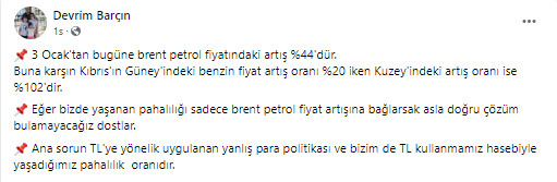 Cumhuriyetçi Türk Partisi (CTP) Milletvekili Devrim Barçın, sosyal medya üzerinden yaptığı bir paylaşım ile akaryakıt zammını eleştirdi.